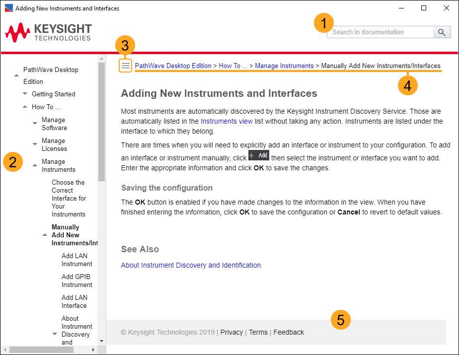 | 5 | Privacy, Terms, and Feedback links take you to this information on http://www.keysight.com. |