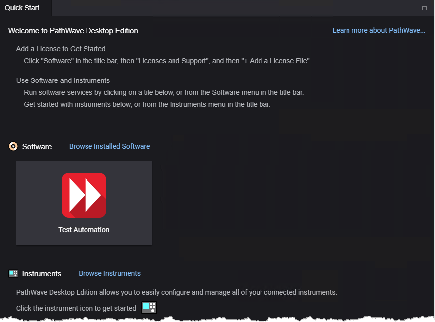 The Quick Start tab is displayed when you launch PathWave Desktop Edition. Quick Start displays the recently installed software and instruments, and links to view the list of installed software and connected instruments.