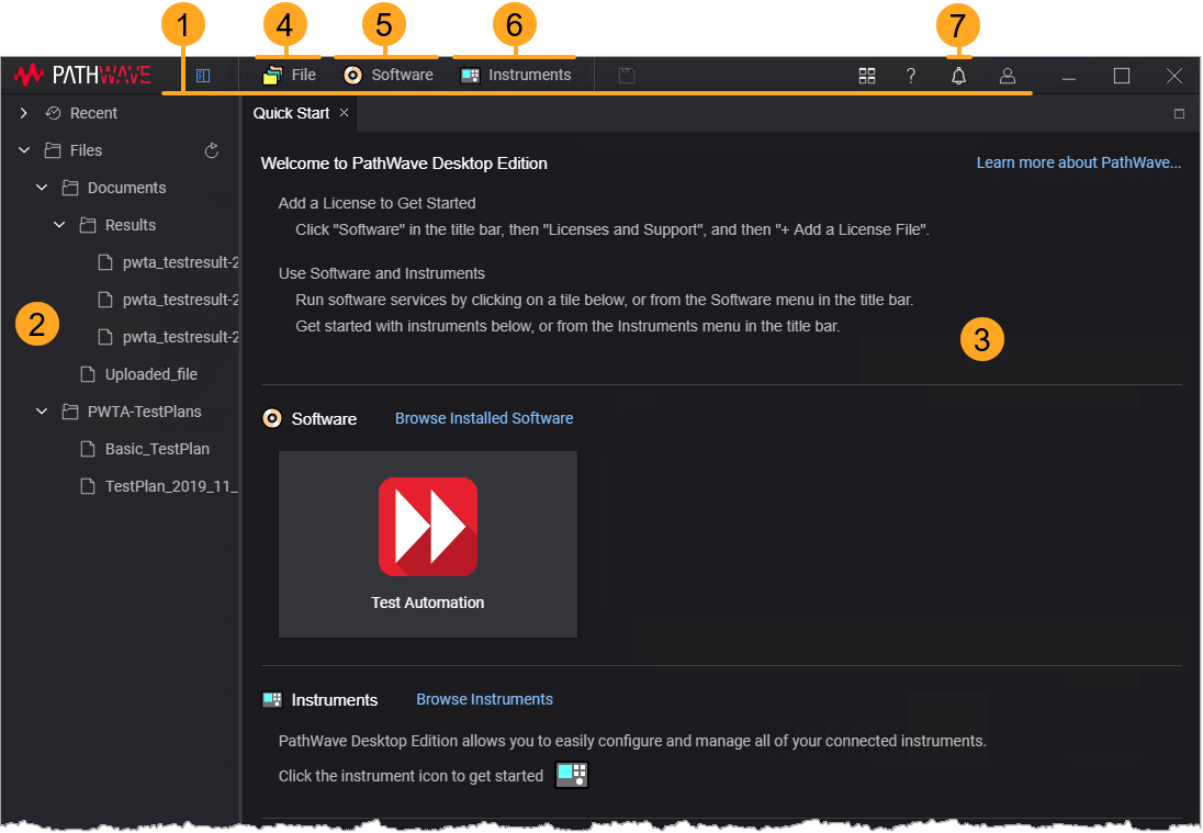 This section introduces you to the PathWave Desktop Edition Graphical User Interface (GUI). You will learn how to navigate through the GUI elements and view some features and functions, before you begin working with the interface.