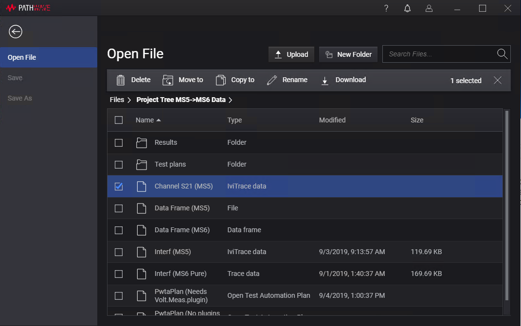 Following details are displayed for the listed files and folders.Column Description Select All Option to select or deselect all the items in the list. Name The name of the file or folder along with the icon. Clicking on the file name will open the file in the associated PathWave service. Type The type of file. Modified Date and time when the file was last modified. Size Size of the file. - Click on the column name to sort the entries by that column.