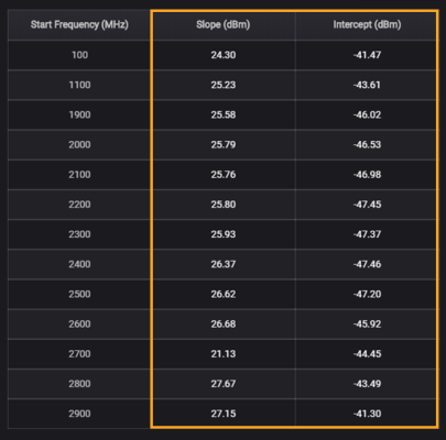 | Steigungs- und Spurpunktwerte (dBm) | Diese Charakterisierungswerte werden von Keysight mit jedem X8712AD HF-Ereignisdetektor bereitgestellt. Es wird empfohlen, die bereitgestellten Daten zu verwenden, um die Tabelle in der Software zu aktualisieren. Damit wird die Leistungsgenauigkeit Ihres HF-Ereignisdetektors verbessert. Die Werte sind in dem mit dem HF-Detektor ausgelieferten gedruckten Exemplar enthalten. Alternativ können Sie sie mithilfe von Infoline abrufen (https://service.keysight.com/infoline/public/default.aspx), indem Sie die Produktnummer „X8712A“ und die Serien-/Identifikationsnummer Ihres HF-Detektors eingeben.