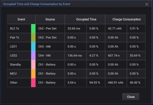 | Ladungsverbrauch | Sortiert synchrone physische oder Stromereignisse innerhalb der Zykluszeit in <Einheit> und prozentualen Anteilen. Synchrone Ladung ist definiert als die Zuordnung des gleichen Zeitpositionsstroms in Kanal 1 und dessen Integration als Ladung nach Ereignis. Die Summe aller Ladungen nach Ereignissen entspricht der Gesamtladung. Ladung nach Ereignis = Synchrone Ladung nach Ereignissen (Ah) / Gesamtladung (Ah) innerhalb der Zykluszeit * 100 %. |
