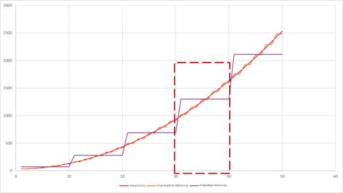 Da der N6705C den durchschnittlichen Stromwert (bzw. den durchschnittlichen Spannungswert) im Abtastzeitraum misst, kann die Genauigkeit der Messung bei einem Downsampling der gemessenen Daten beibehalten werden. Der N6705C stellt effektiv erneut den Durchschnitt der gemessenen Daten über den neuen Abtastzeitraum her. Stellt man sich die gemessene Stromstärke (oder Spannung) gemessen an der Zeit als die Fläche unter der Kurve vor, so können wir durch erneutes Abtasten die Genauigkeit der ursprünglichen abgetasteten Daten bewahren (mit höherer Geschwindigkeit gemessen). Im folgenden Beispiel ist die rote Spur die tatsächliche Wellenform, die orangefarbene Spur die ursprüngliche Abtastung und die violette Spur die endgültige Abtastung. Betrachten wir einen beliebigen gemeinsamen Zeitraum aller drei Abtastraten, ist die Summe der Daten (Fläche unter der Kurve) gleich. Betrachten wir in diesem Beispiel die Fläche unter der Kurve von 31 bis 40, sehen wir, dass sie bei 13005 für alle drei Kurven gleich sind.
