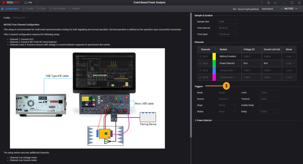 - Der Einzelmodus wird zur Erfassung von Informationen mit hoher Genauigkeit verwendet und bietet die Möglichkeit, schnelle Ereignisse mit hohem Detailgrad zu analysieren. Dieser Modus eignet sich zur Messung von Ereignissen mit schnellen Abtastraten, z. B. IoT-HF-Ereignisse (Hunderte von Mikrosekunden) wie BLE-Signale. In diesem Modus können Sie nach Details suchen, wie sich ein HF-Ereignis im Vergleich zu einer LED auf die Batteriebetriebsdauer auswirken könnte.