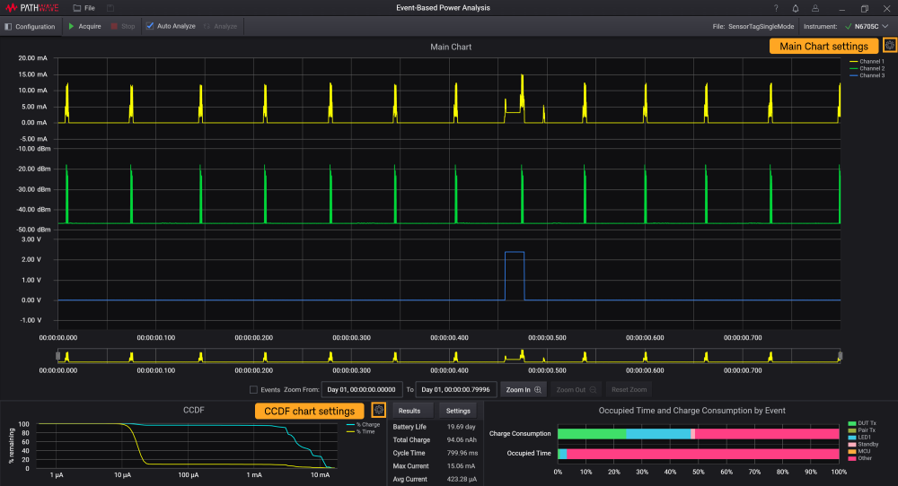 Show Waveforms 각 확인란을 선택하면 충전(백분율) 또는 시간(백분율) 트레이스가CCDF 차트에 표시됩니다. 차트에서 최소한 하나 이상의 파형을 표시해야 합니다. 변경 사항은 대화 상자를 닫을 때 반영됩니다. |