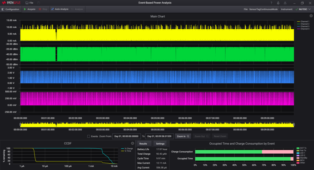- 이제 메인 차트에서 데이터와 파형을 볼 수 있습니다. 데이터 분석 진행에는 결과 보기에 설명되어 있는 기능을 사용합니다. 각 차트의 각 설정에 대한 정의는 메인 차트와 분석 결과 및 차트에서 각각 찾아볼 수 있습니다.