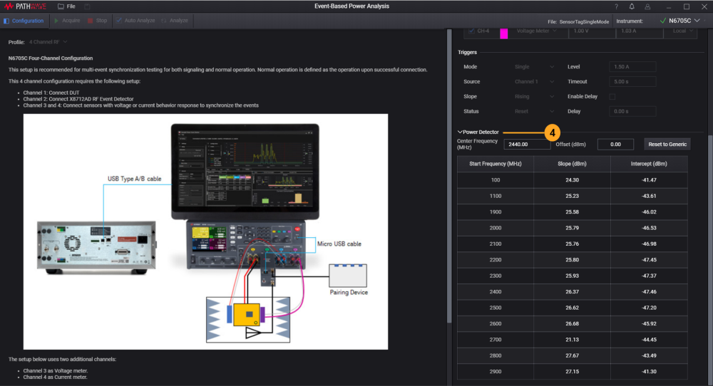 | Slope 및 Intercept 값(dBm) | 이러한 특성값은 Keysight가 각 X8712AD RF 이벤트 감지기를 통해 제공합니다. 제공된 데이터를 사용하여 소프트웨어의 테이블을 업데이트하는 것이 좋습니다. 그러면 RF 이벤트 감지기의 전력 정확도가 향상됩니다. 해당 값은 RF 감지기와 함께 제공되는 인쇄본에서 확인할 수 있습니다. 또는 Infoline(https://service.keysight.com/infoline/public/default.aspx)에서 제품 번호 'X8712A'와 RF 감지기의 Serial/ID 번호를 입력하여 검색합니다.
