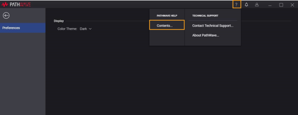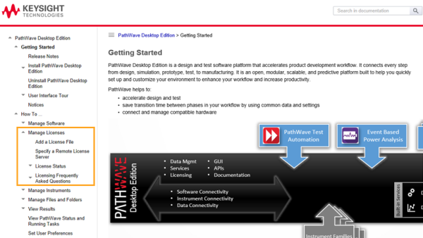 PathWave Desktop Edition에서 라이선스를 관리하는 방법에 대한 지침을 보려면, ? 아이콘을 클릭하고 아래와 같이 PathWave 도움말 내용을 선택합니다.