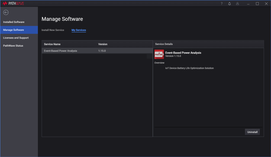 이 보기에서는 PathWave 서비스를 설치하거나 제거할 수 있습니다. 또한 여기서 서비스 버전 번호를 볼 수도 있습니다.